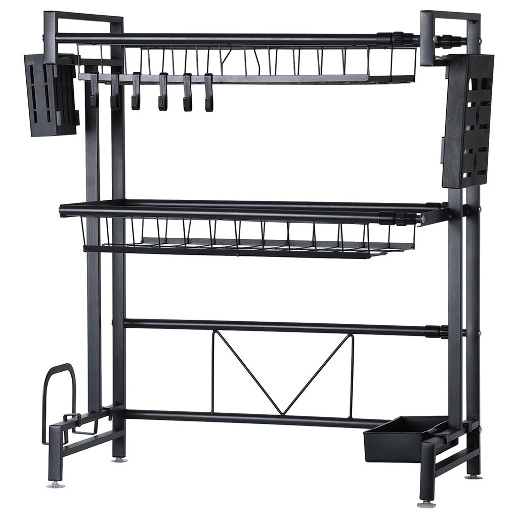 يحتوي الحامل على أقسام مخصصة لتجفيف الأطباق، الملاعق، أدوات التنظيف، والفواكه أو الخضار.