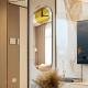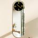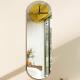 Horloge à Double Miroir – La base est un miroir oval haute définition de 90×35 cm, offrant une réflexion claire qui accentue la profondeur et le caractère moderne de l’espace, Le cadran est un verre rond marron fumé de 25.6 cm de diamètre, précis dans l’affichage de l’heure et apportant une touche chaleureuse de couleur